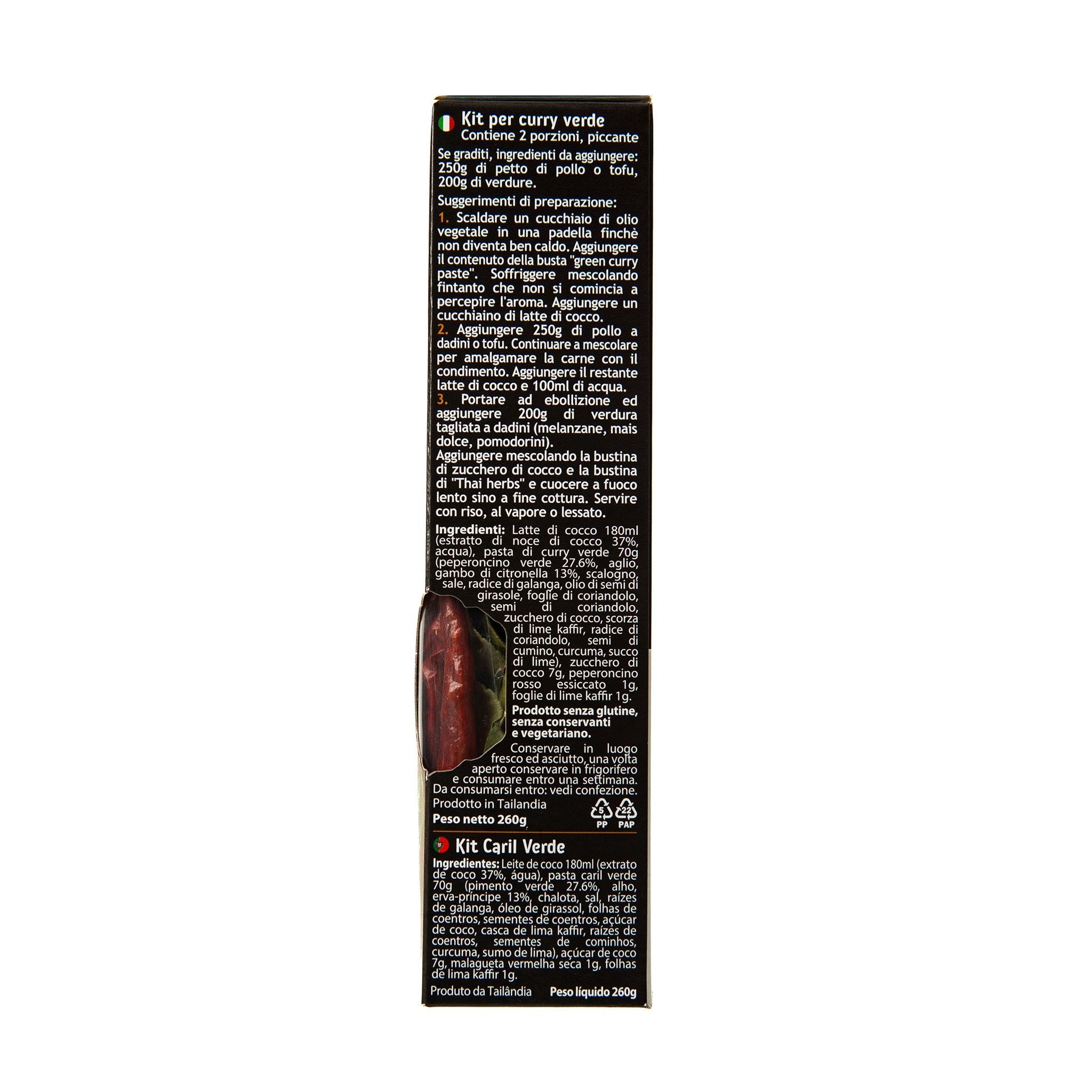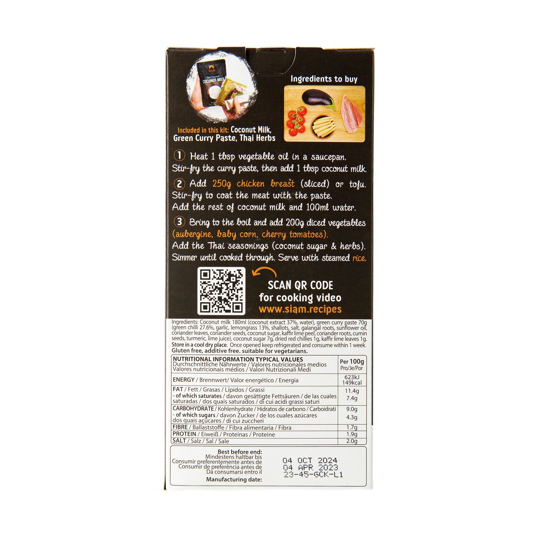 Ingredients: Coconut Milk 190g [Coconut extract (Coconut, Water) 37.00%, Water], Green curry paste 70g (Green Chilli 27.60%, Garlic, Lemongrass 13.00%, Shallots, Salt, Galangal Roots, Sunflower Oil, Coriander Leaves, Coriander Seeds, Coconut Sugar, Kaffir Lime Peel, Coriander Roots, Cumin Seeds, Turmeric, Lime Juice), Coconut Sugar 7g, Dried Red Chilli 1g, Kaffir Lime Leaves 1g.