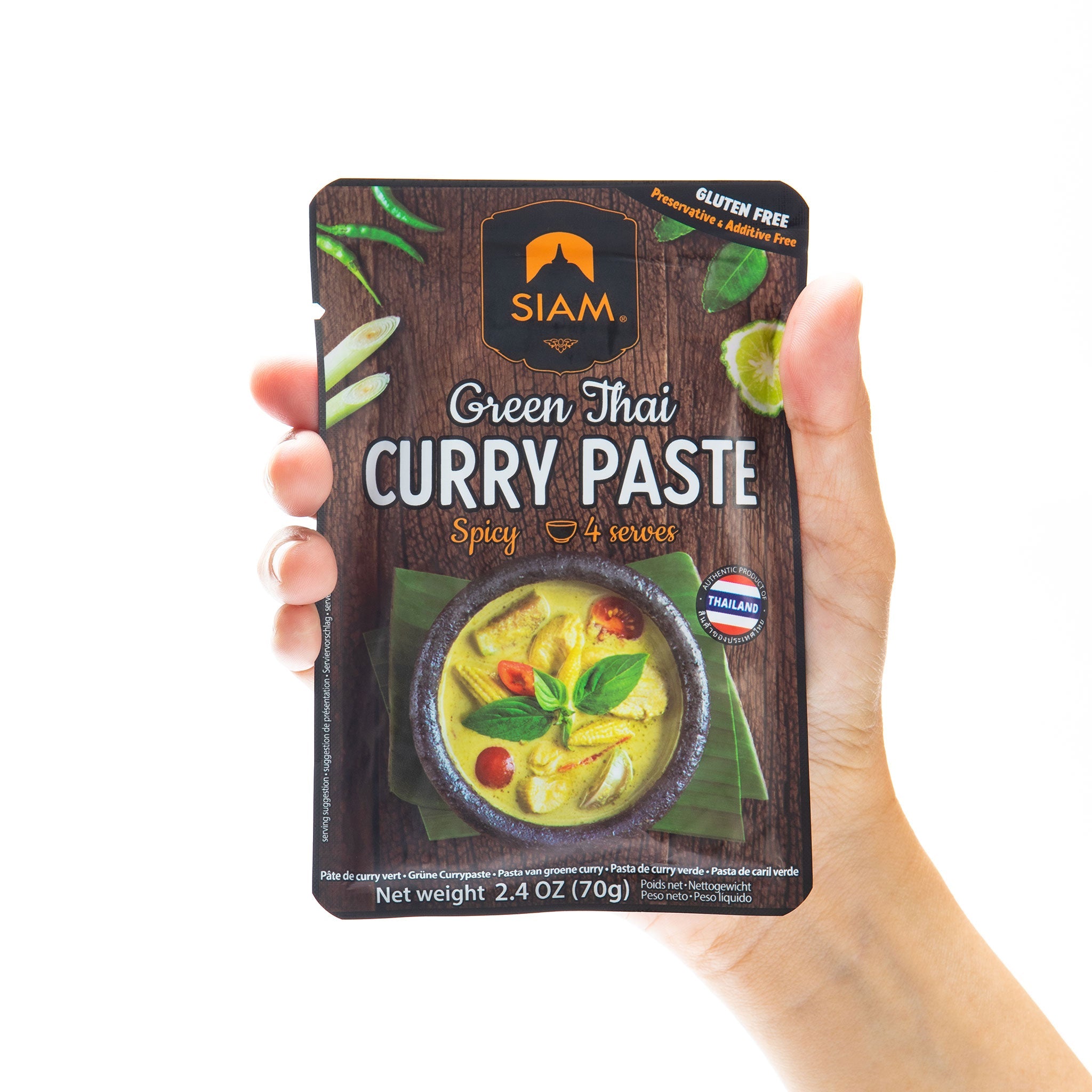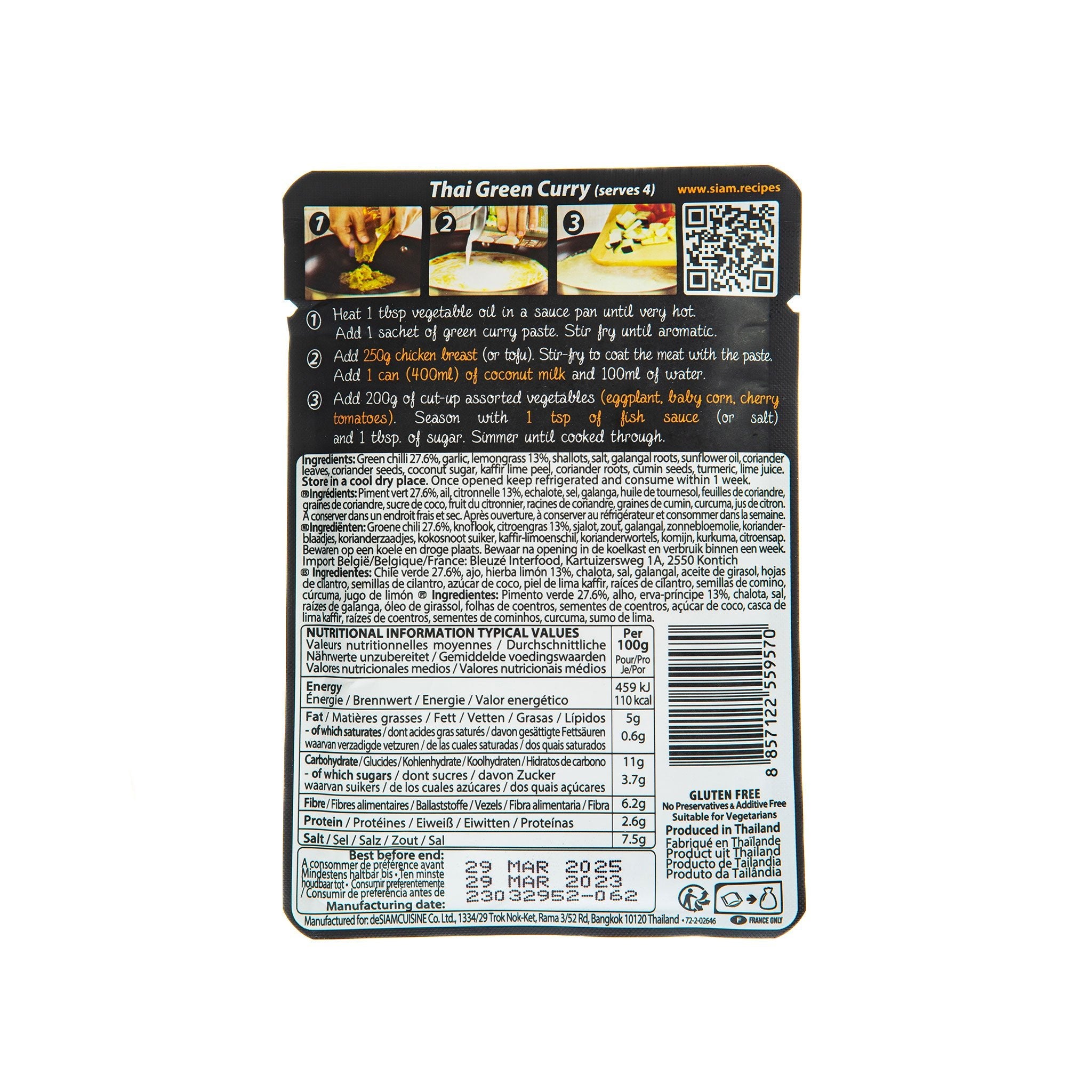 Ingredients: Green Chilli 27.60%, Garlic, Lemongrass 13.00%, Shallots, Salt, Galangal Roots, Sunflower Oil, Coriander Leaves, Coriander Seeds, Coconut Sugar, Kaffir Lime Peel, Coriander Roots, Cumin Seeds, Turmeric, Lime Juice.