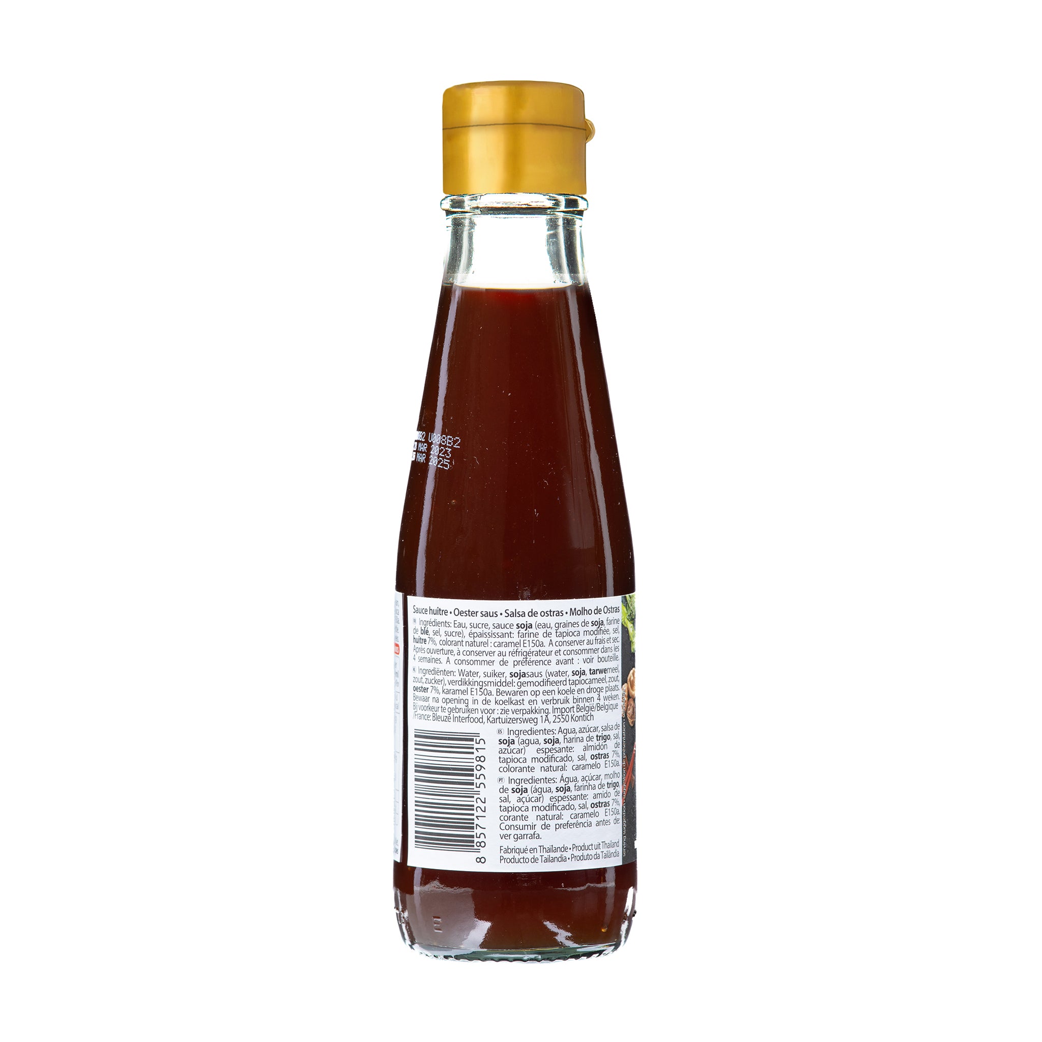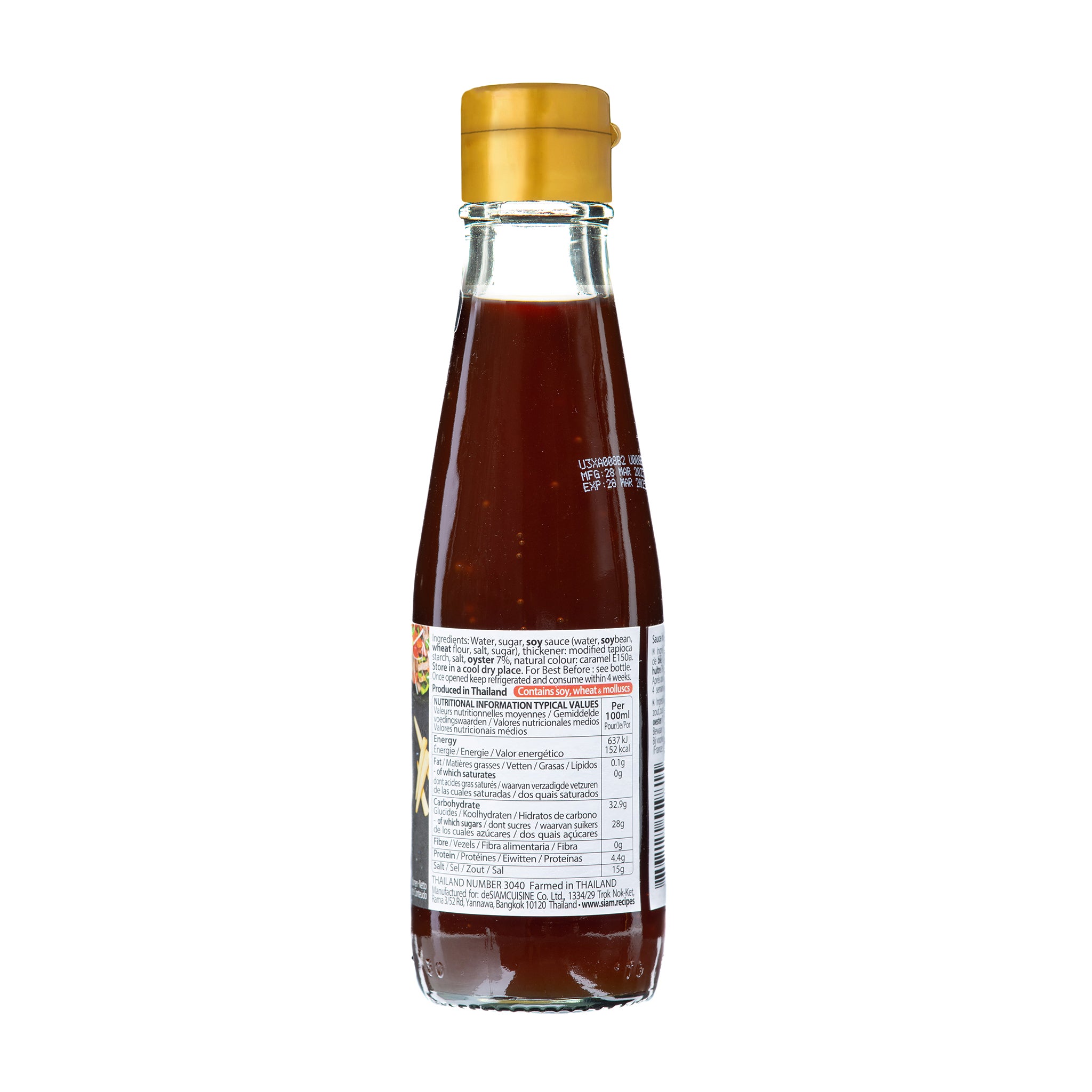 Ingredients: Water, Sugar, Soy Sauce (Water, Soybeans, Wheat Flour, Salt, Sugar), Thickener: Modified Tapioca Starch, Salt, Oyster 7.00%, Colour: Caramel E150a.