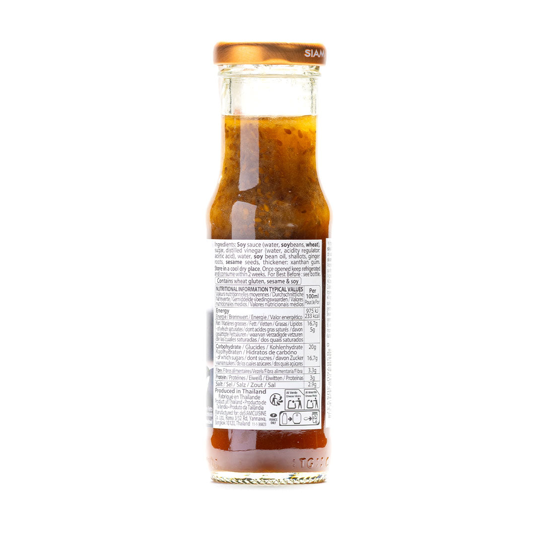 Ingredients: Soy Sauce (Water, Soybeans, Wheat Flour, Salt, Sugar) 25.00%, Sugar, Distilled Vinegar (Water, Acidity Regulator: Acetic Acid), Water, Soy Bean Oil, Shallots, Ginger roots, Sesame Seeds, Thickener: Xanthan Gum.