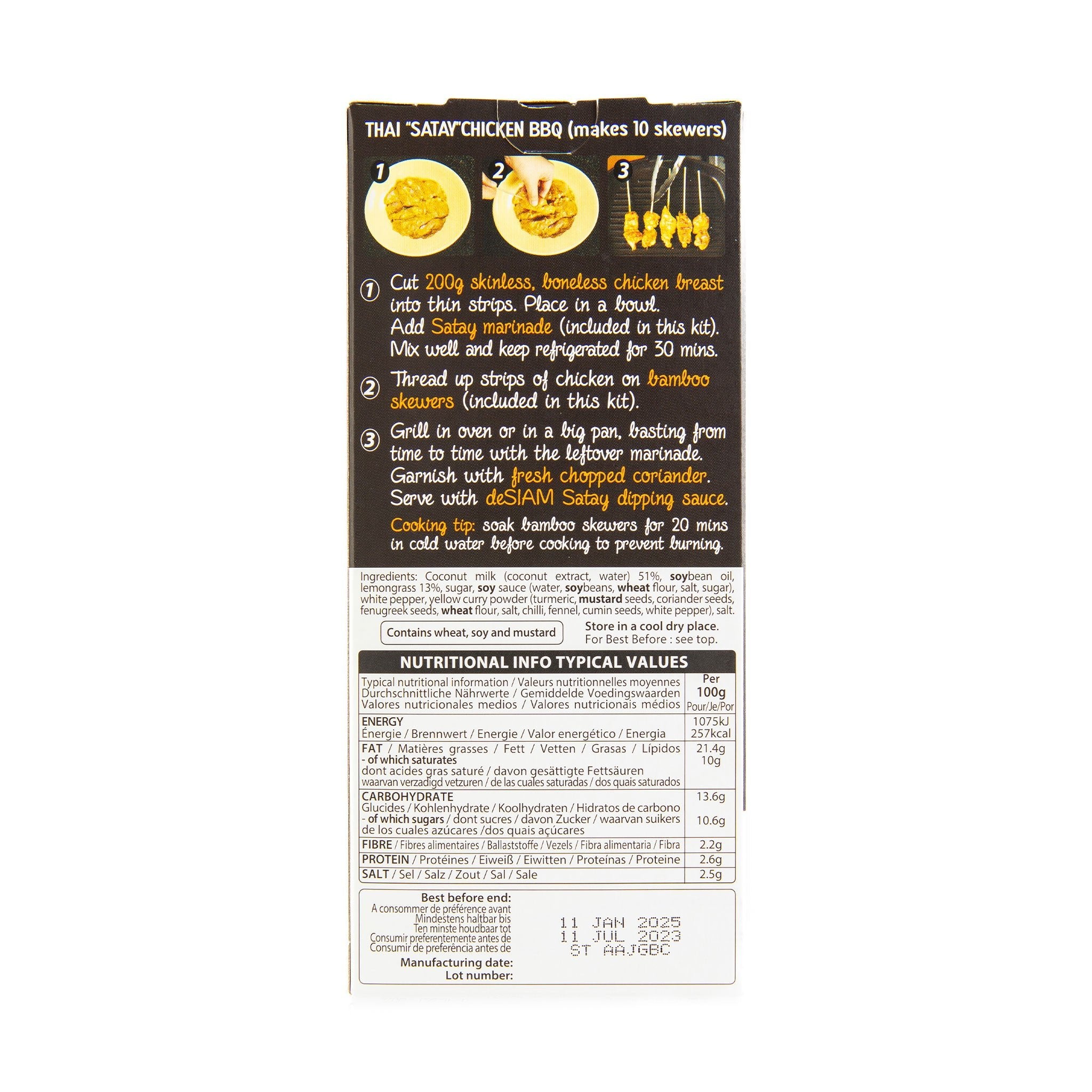 Ingredients: Coconut Milk (Coconut extract, Water) 51.00%, Soy Bean Oil, Lemongrass 13.00%, Sugar, Soy Sauce (Water, Soybeans, Wheat Flour, Salt, Sugar), White Pepper, Yellow Curry Powder (Turmeric, Mustard Seeds, Coriander Seeds, Fenugreek seeds, Wheat Flour, Salt, Chilli, Fennel, Cumin Seeds, White Pepper), Salt.