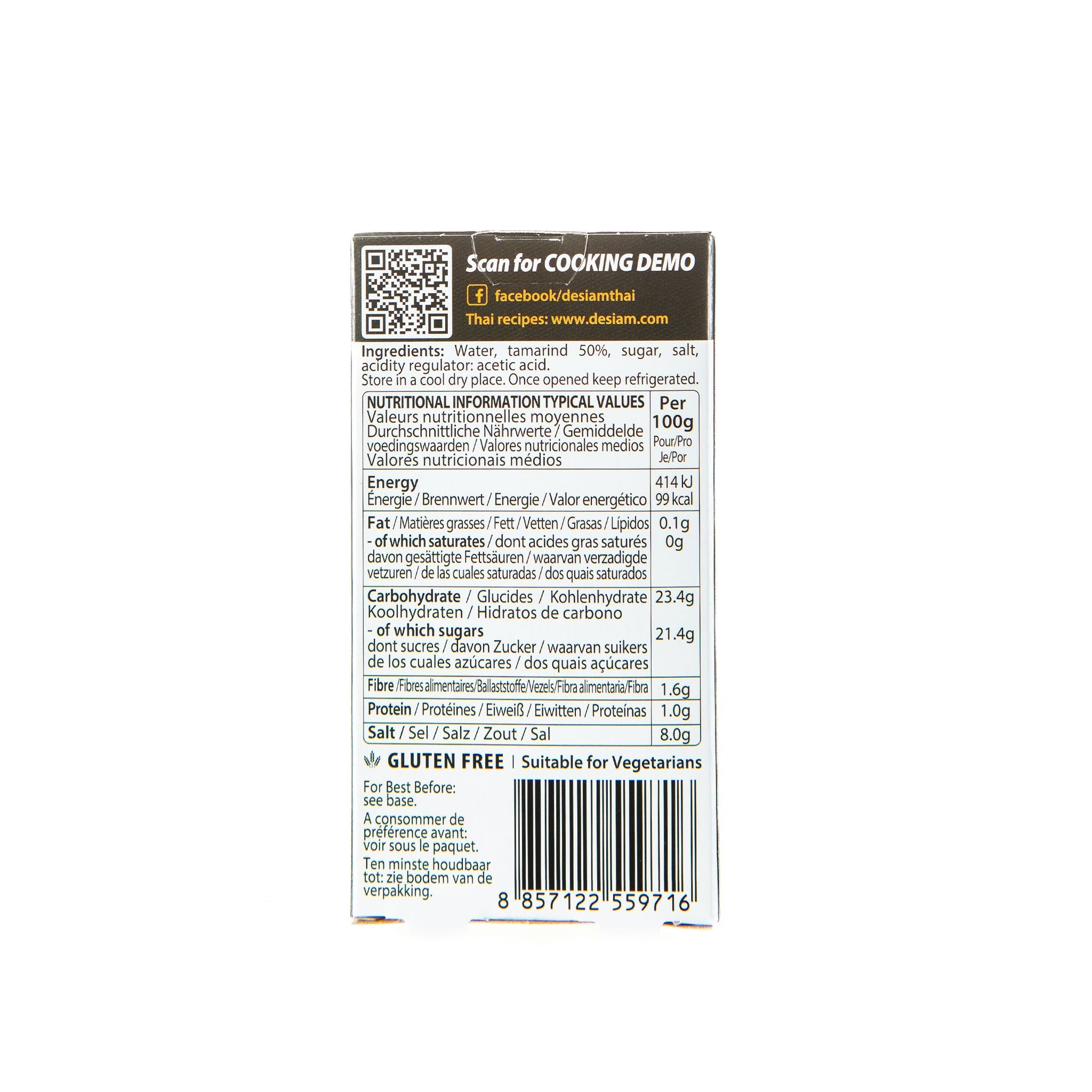 Ingredients: Water, Tamarind 50.00%, Sugar, Salt, Acidity Regulator: Acetic Acid.