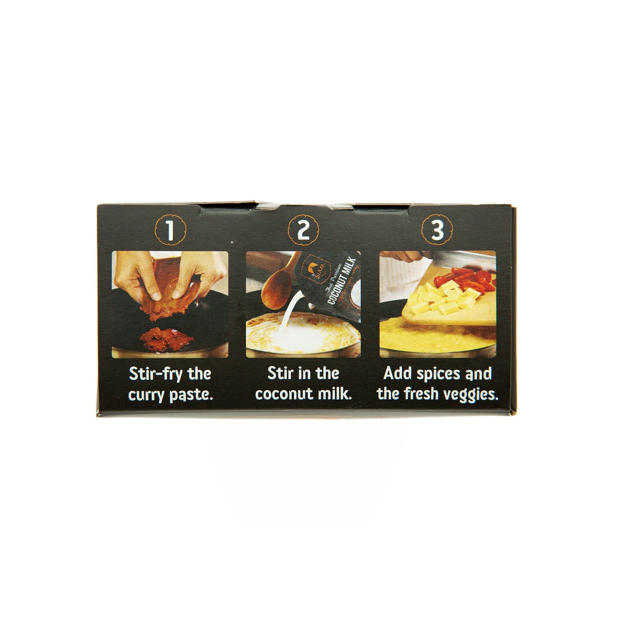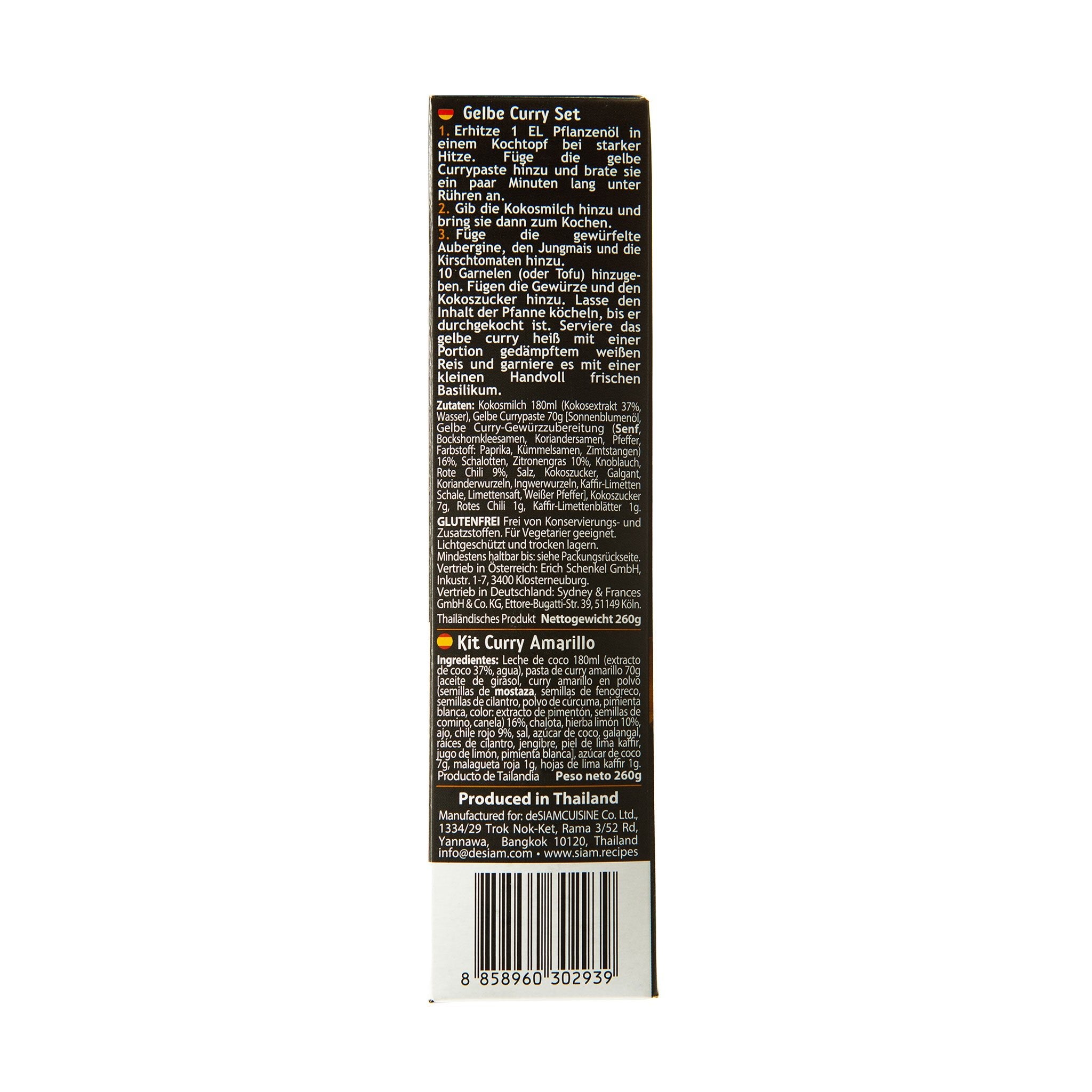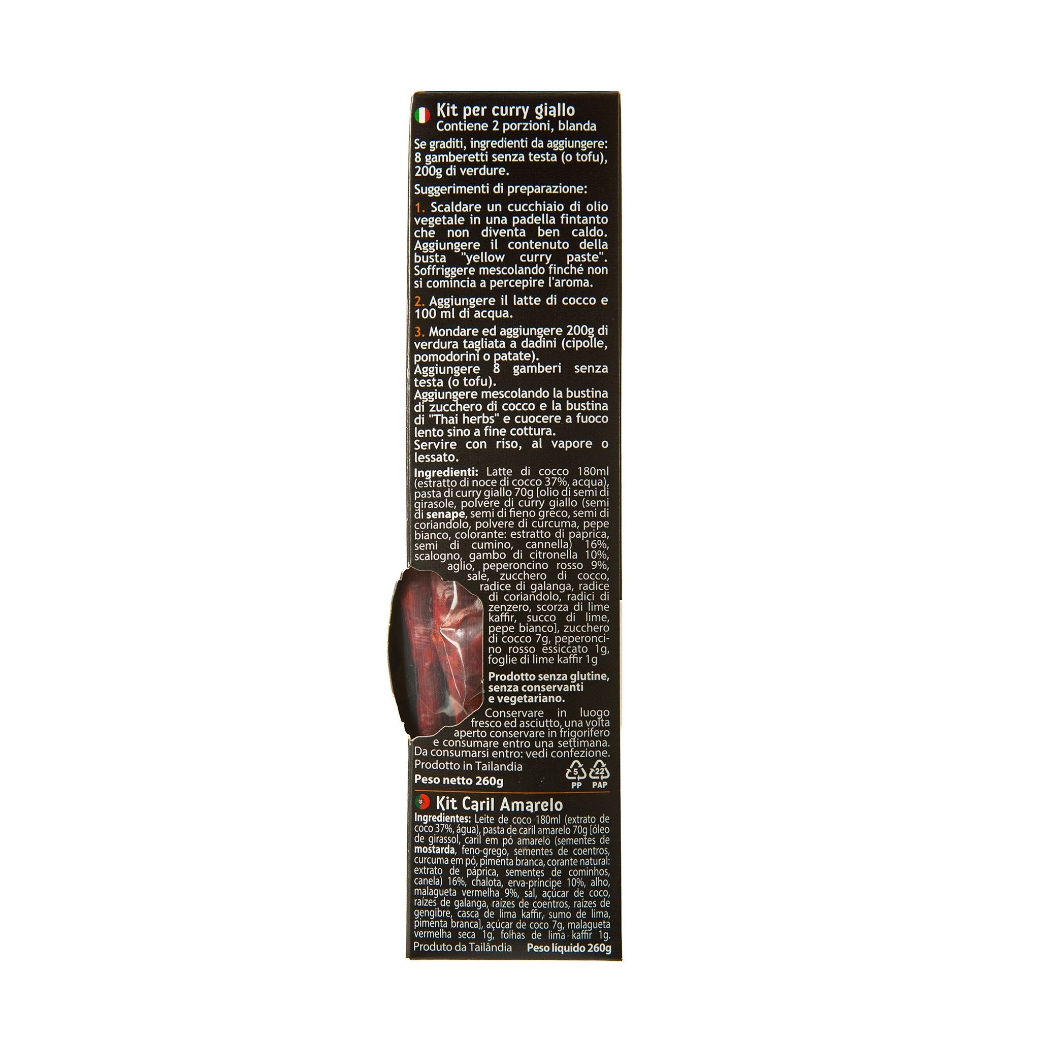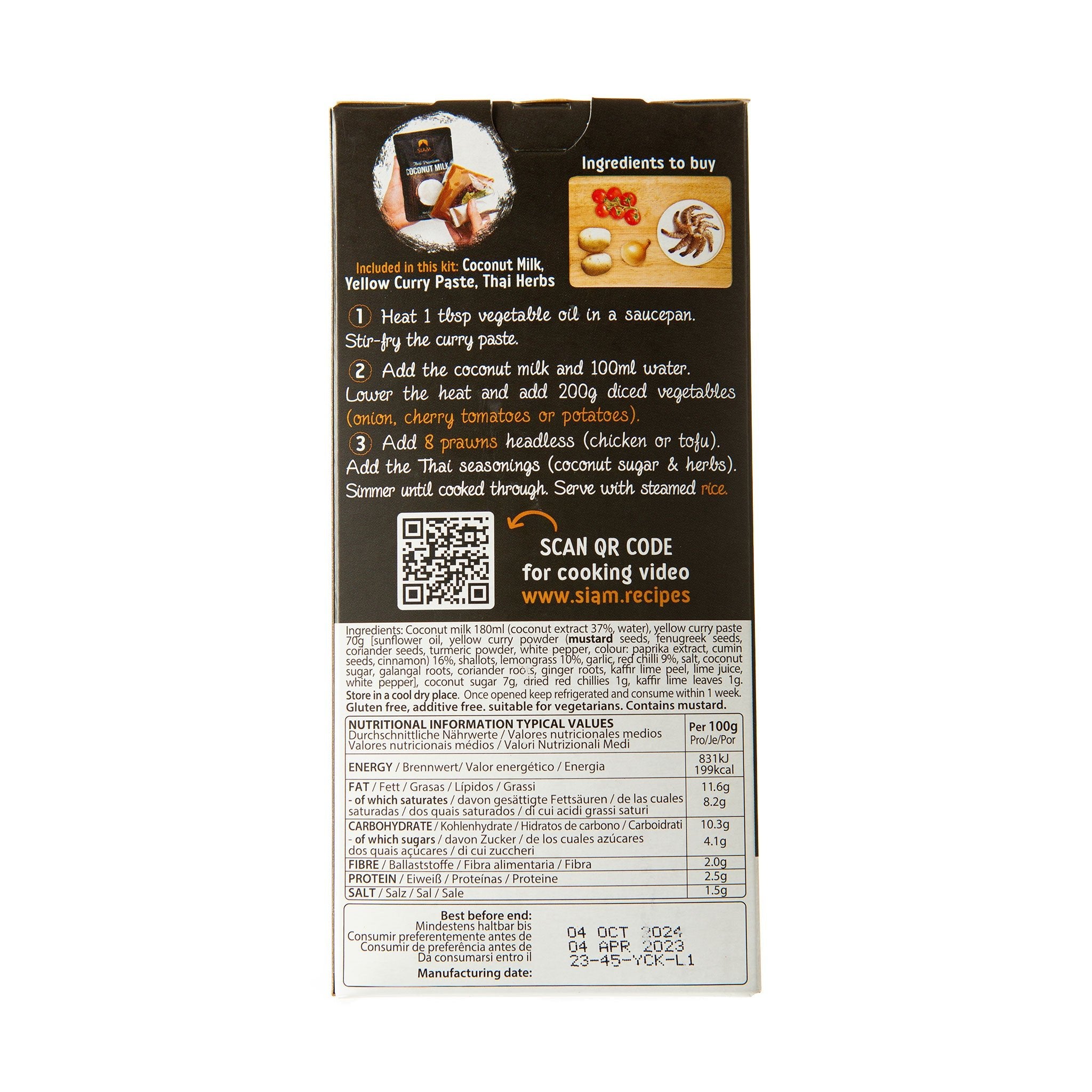 Ingredients: Coconut Milk 190g [Coconut extract (Coconut, Water) 37.00%, Water], Yellow Curry Paste 70g [Sunflower Oil, Yellow Curry Powder (Mustard Seeds, Fenugreek seeds, Coriander Seeds, Turmeric Powder, White Pepper, Colour: Paprika Extract, Cumin Seeds, Cinnamon) 16.00%, Shallots, Lemongrass 10.00%, Garlic, Red Chilli 9.00%, Salt, Coconut Sugar, Galangal Roots, Coriander Roots, Ginger roots, Kaffir Lime Peel, Lime Juice, White Pepper], Coconut Sugar 7g, Dried Red Chilli 1g, Kaffir Lime Leaves 1g.