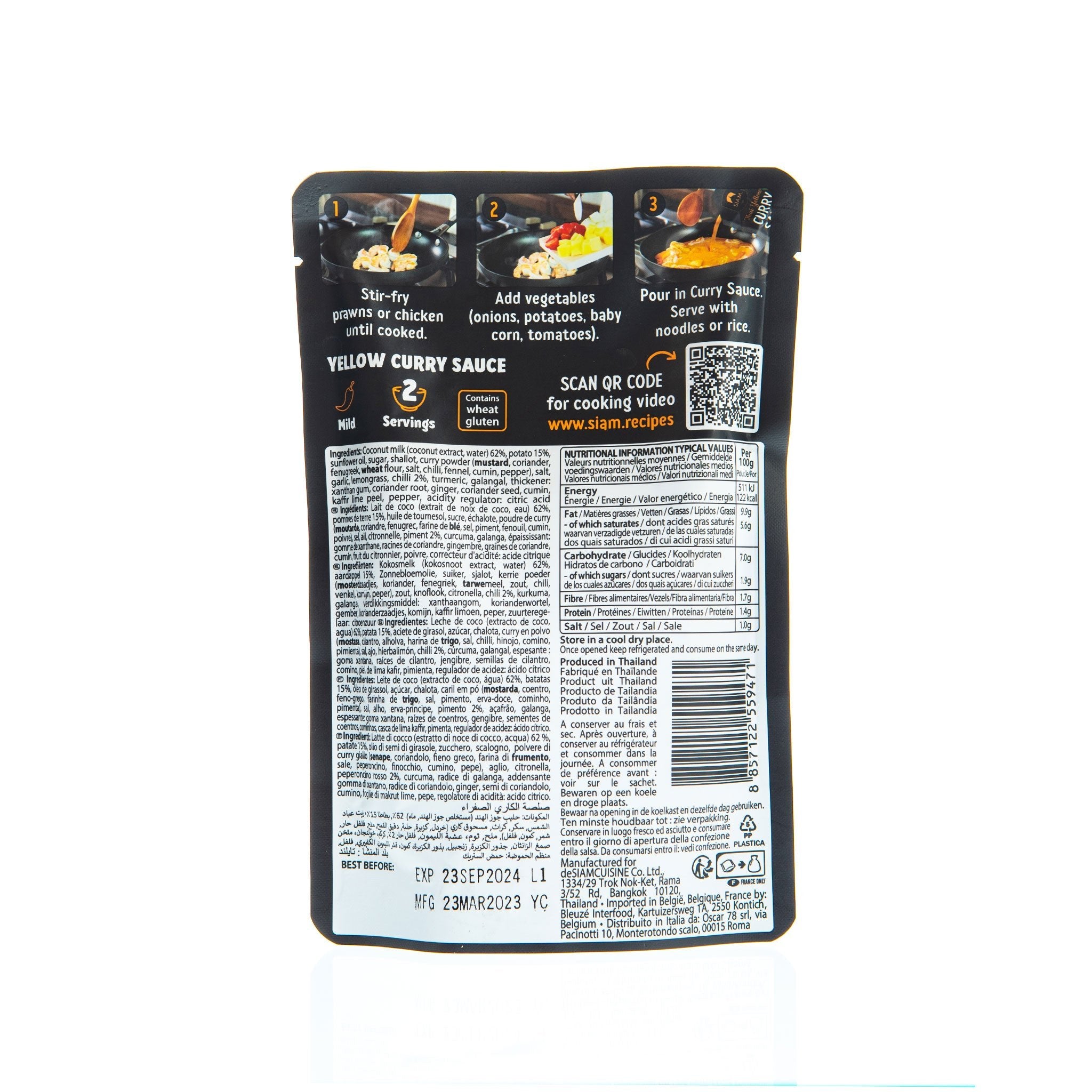 Ingredients: Coconut Milk (Coconut extract, Water) 62.00%, Potato 15.00%, Sunflower Oil, Sugar, Shallots, Yellow Curry Powder (Turmeric, Mustard Seeds, Coriander Seeds, Fenugreek seeds, Wheat Flour, Salt, Chilli, Fennel, Cumin Seeds, White Pepper), Salt, Garlic, Lemongrass, Chilli, Turmeric, Galangal Roots, Thickener: Xanthan Gum, Coriander Roots, Ginger roots, Coriander Seeds, Cumin Seeds, Kaffir Lime Peel, Acidity Regulator: Citric Acid.